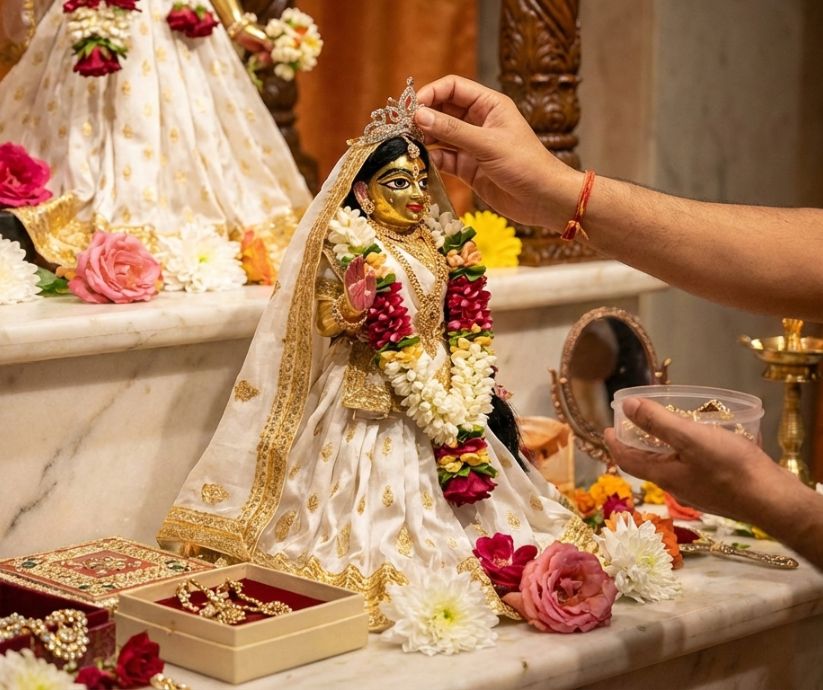 Book sacred Radha Rani Puja and Seva online and offer your devotion through Puja Archana, Shringar, Abhishek, Bhog, Annadan and special festival sevas. Each seva is performed in your name with proper sankalp inside the temple according to Vaishnava traditions, and we will share pictures and videos of the Seva with you. You may also apply for an 80G receipt.